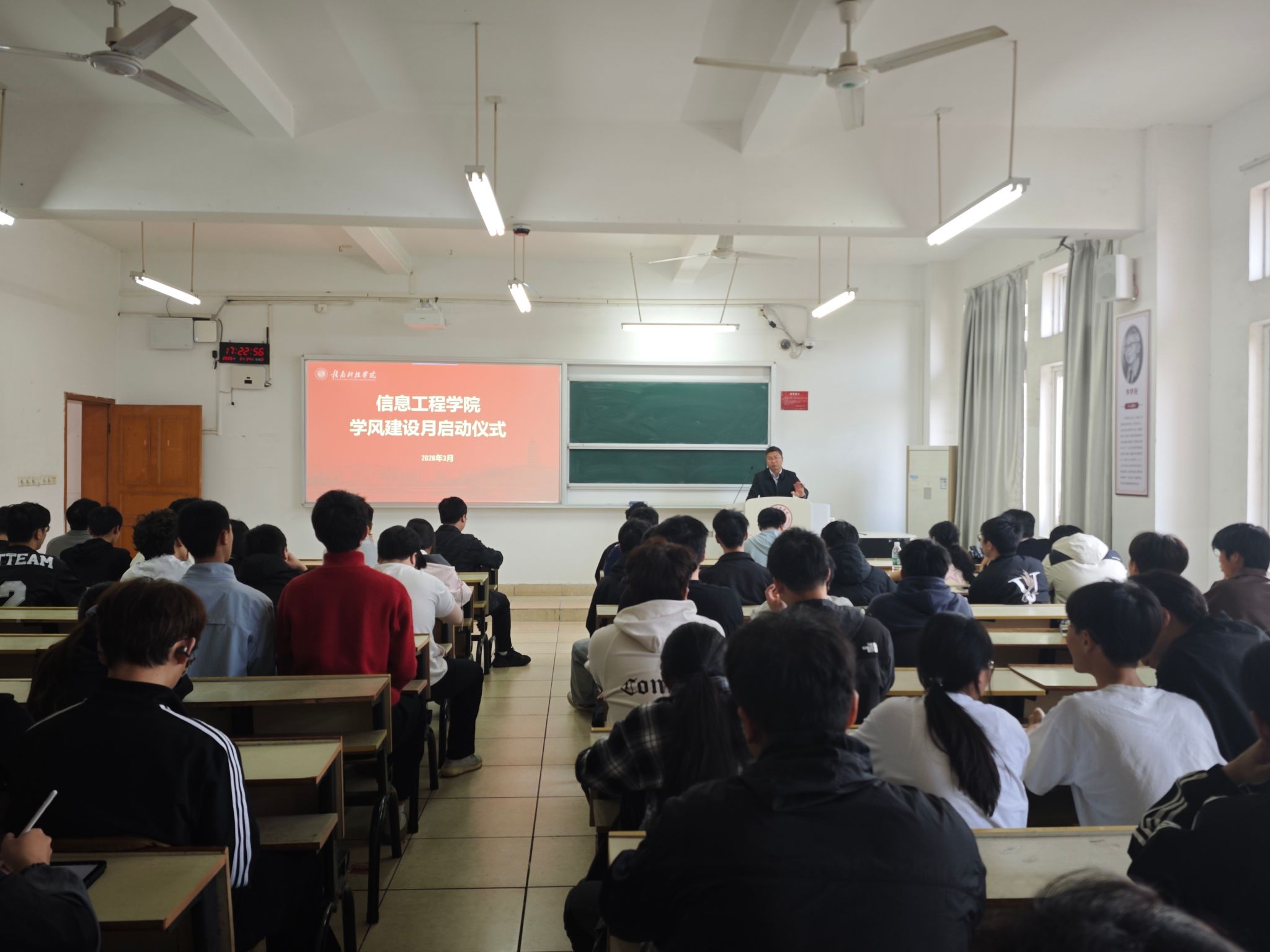 学院学工办主任魏炳辉作学风建设动员讲话。魏炳辉深刻剖析了学风建设对学院发展和学生个人成长的重要意义,并指出了当前学院学风建设中存在的问题与不足。针对本次“学风建设月”,他提出了三点殷切期望与要求:一是“立规矩”,强调要严格落实课堂考勤和晚自习制度,狠抓纪律底线;二是“正态度”,呼吁同学们告别“低头族”和“躺平”心态,回归学习本位;三是“树标杆”,要求学生党员、班干部要亮明身份,发挥“头雁效应”,带头营造比学赶帮超的良好氛围。他勉励全体师生以此次学风建设月为契机,真抓实干,让优良学风成为永利y23455最亮丽的底色。