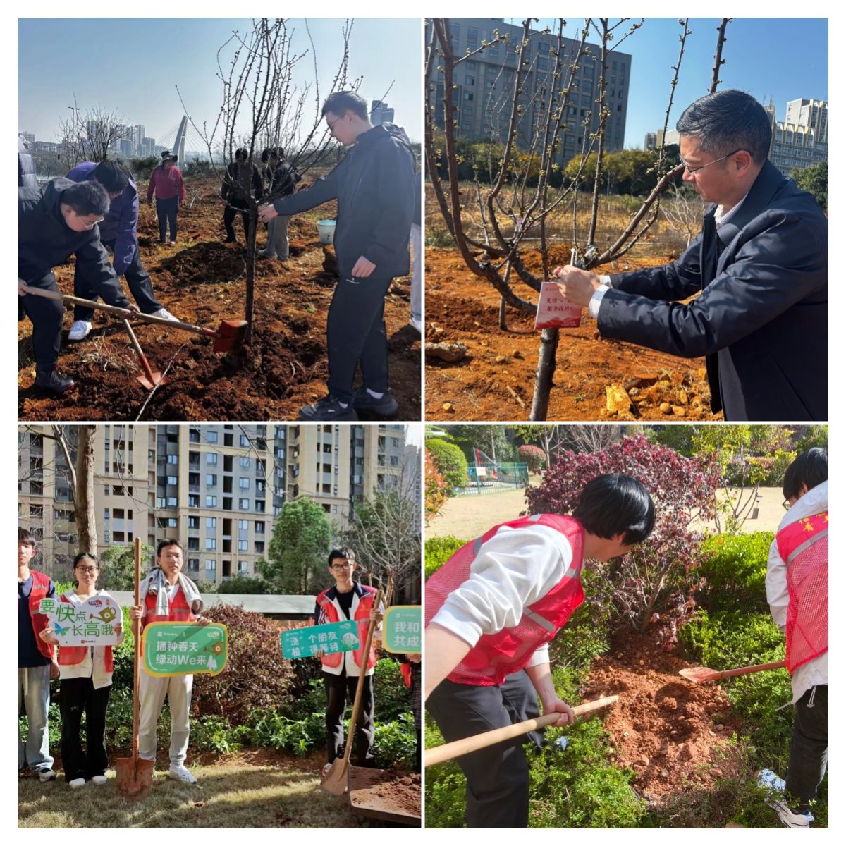 校园植绿,播撒希望种子。植树节前后,学院在校园内和社区两地组织开展植树志愿活动。师生们挥锹铲土、扶苗填坑、提水浇灌,各个环节配合默契。一棵棵新苗迎风挺立,不仅美化了环境,更在同学们心中种下了绿色发展与劳动教育的种子。