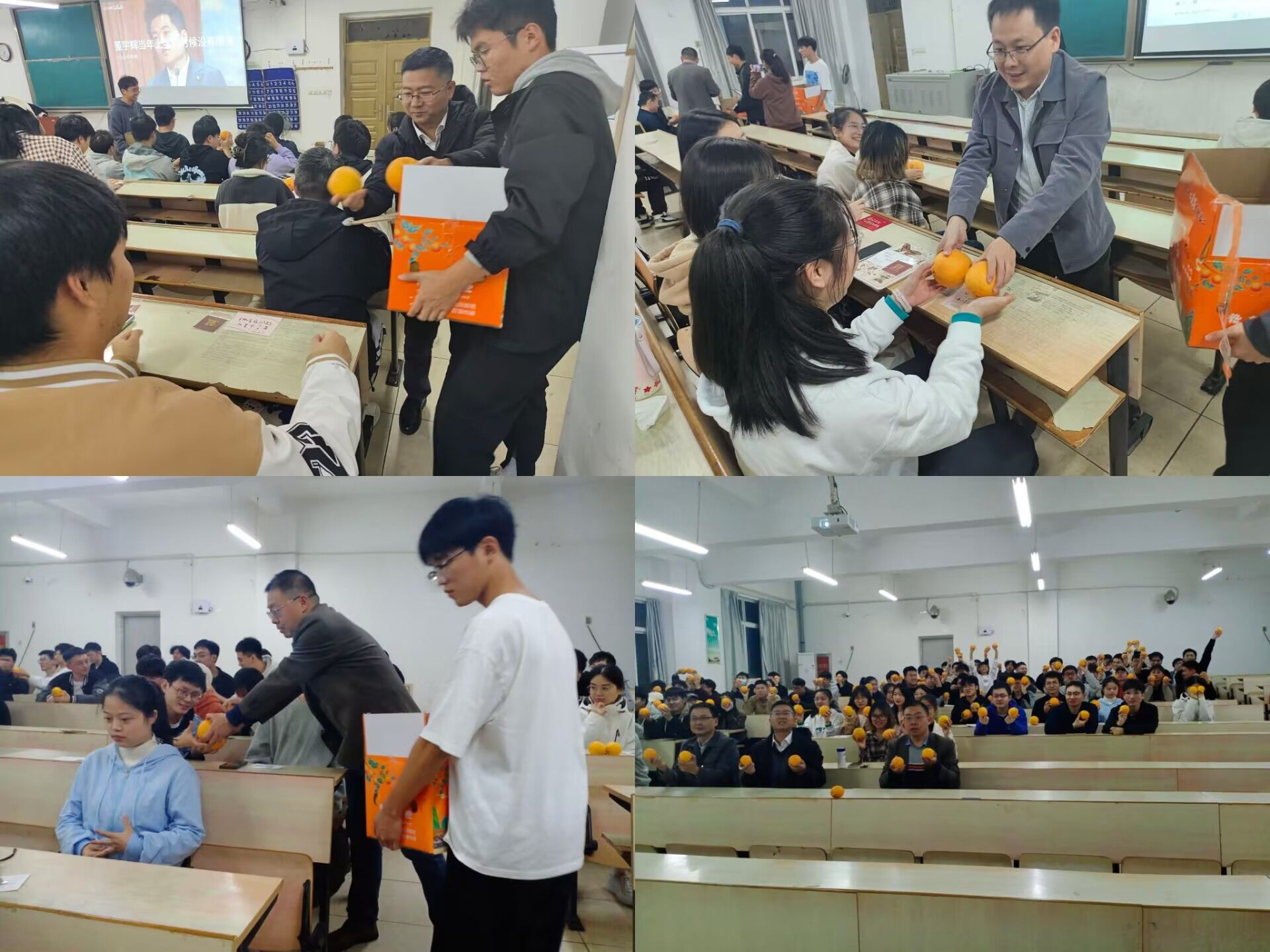 随后,三位老师为考研学子们分发脐橙和考研加油包。