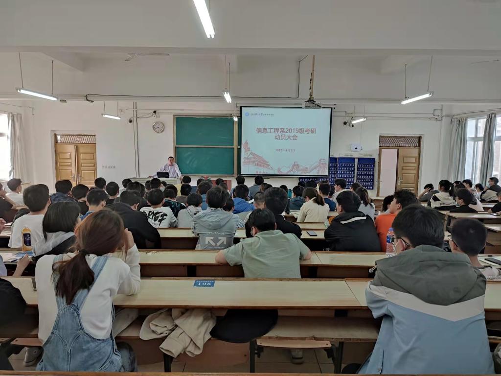本网讯:为帮助2019级考研学子及时解决和处理在考研过程中遇到的各种困难和问题,端正考研态度,增强考研信心,4月7号下午,信息工程系在教学主楼Z1D3教室举行了2019级考研动员大会。信息工程系党总支书记邓小鸿、学工副主任魏炳辉,2019级年级辅导员龚峣,2018级考研成绩优异的四位同学代表以及2019级全体同学到场参加了会议。