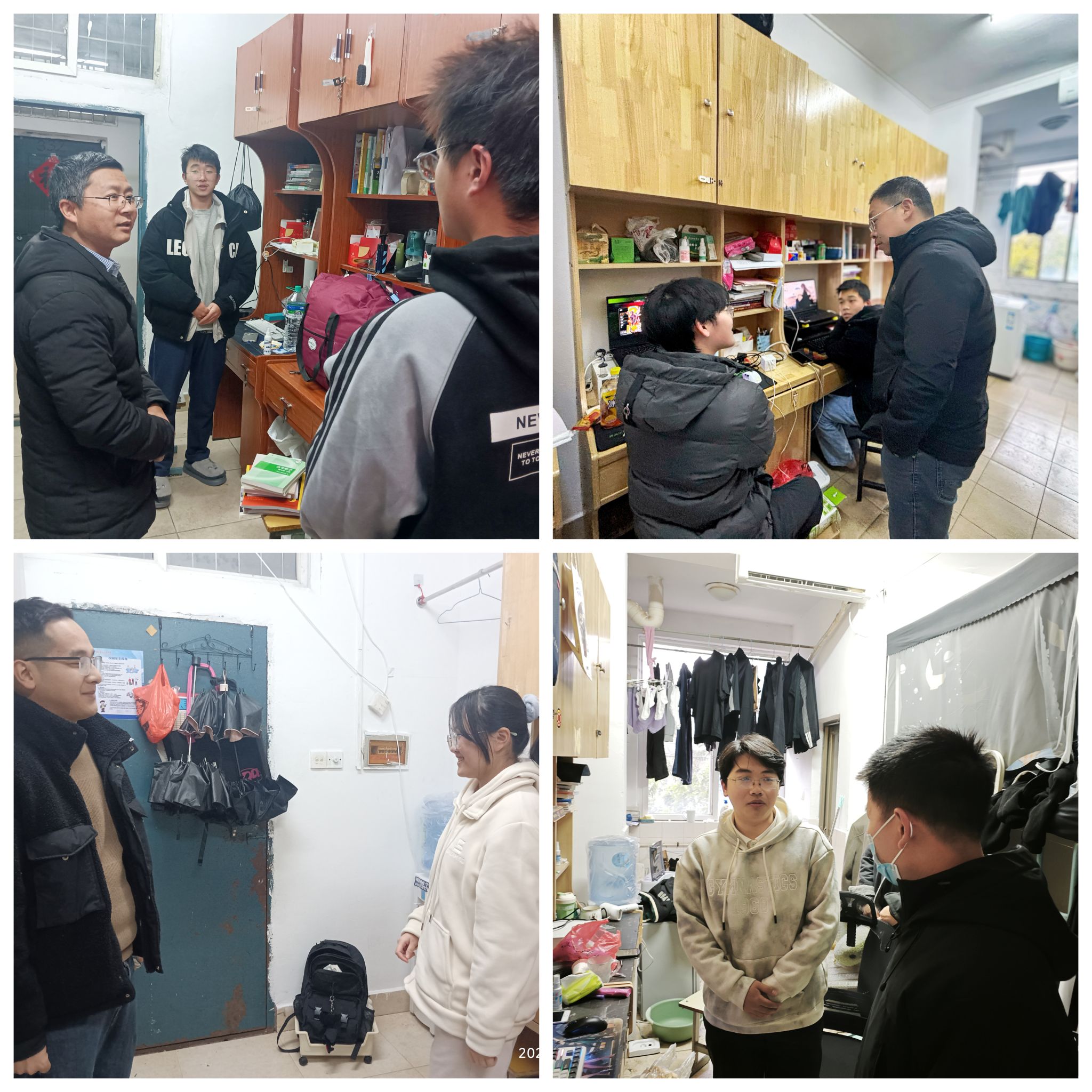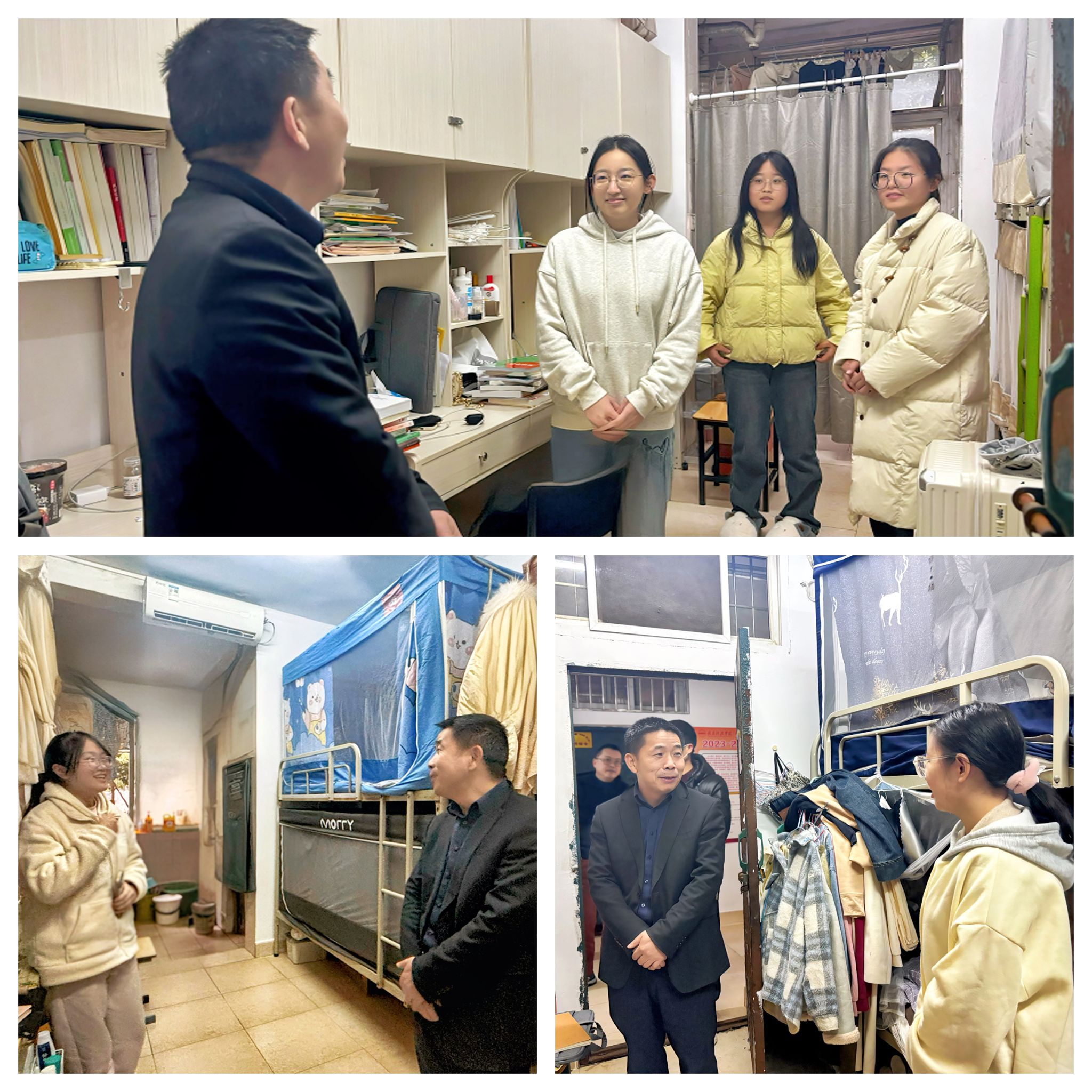 走访过程中,何锦龙亲切地和同学们聊起家常,“家乡是哪里的?”“寒假过得怎么样?”“开学是否有补考?”“新学期有什么规划?”……围绕学习生活的方方面面,送上来自学校的关心与温暖。提醒同学们要及时调整开学状态,规划好大学生活,多读书、勤学习、善交际、强体魄,在德智体美劳各方面均衡发展;同时要增强安全意识,时刻注意好寝室安全和用电安全,保持好个人卫生和宿舍卫生,共同维护一个安全、健康、和谐的住宿环境。缕缕关怀,沁入心田;句句叮咛,温暖人心。学生宿舍内欢声笑语不断,学生深切感受到“赣科家”的关怀与温暖,增强了归属感与幸福感。