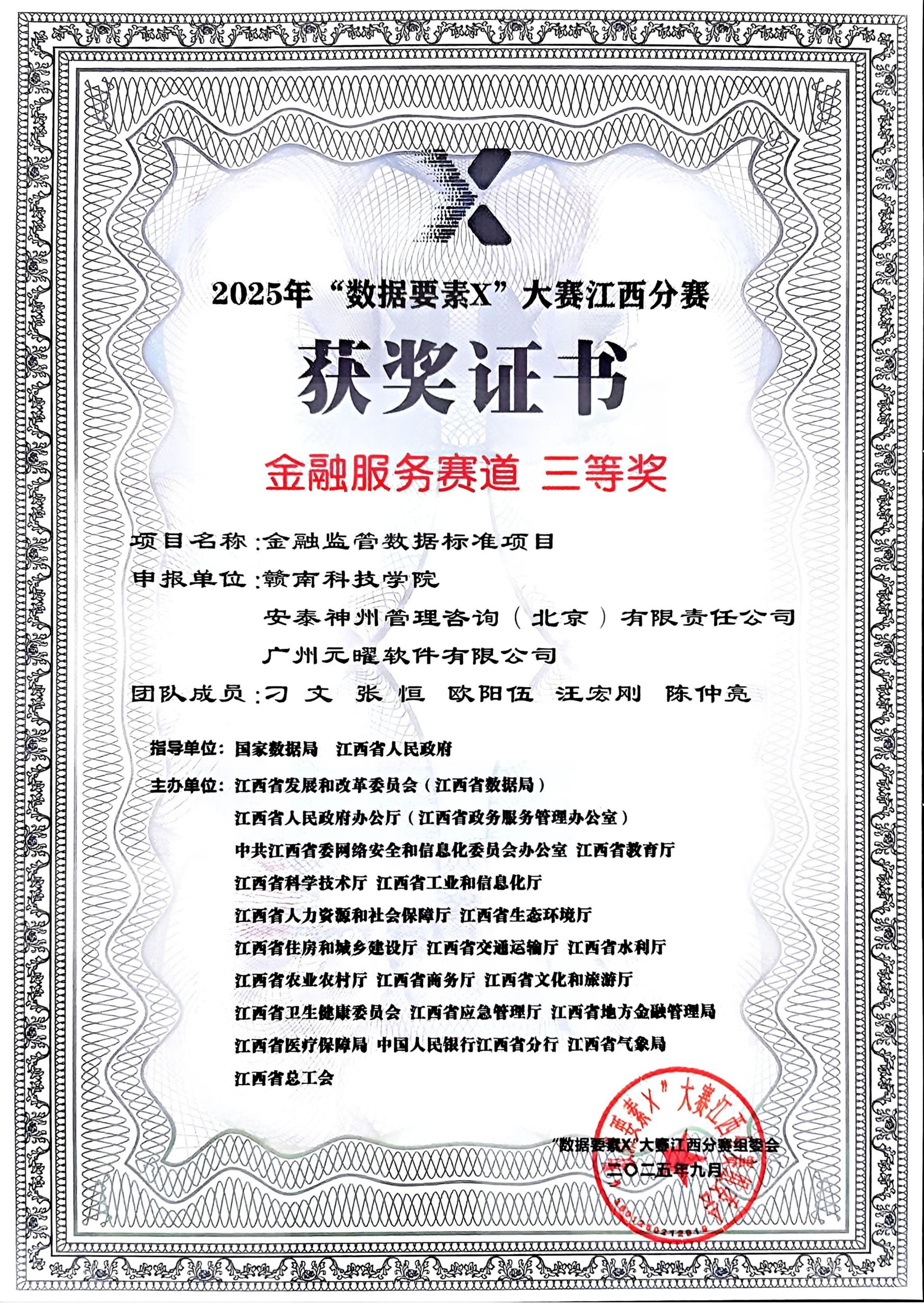 本网讯:近日,由国家数据局、江西省人民政府指导,江西省发展改革委(省数据局)联合20家省直部门共同主办的2025年“数据要素×”大赛江西分赛决赛获奖名单发布,我校永利y23455专任教师刁文、张恒、欧阳伍团队凭借“金融监管数据标准项目”在金融服务赛道中脱颖而出,荣获三等奖,位列全省第10。这是我校首次在此项国家级赛事中获奖,实现了历史性突破。该项目充分发挥数据要素在金融行业的乘数效应,构建了能跨越不同监管、具备高可操作性的金融监管数据标准体系,有效提高了金融服务领域的数据分析能力。