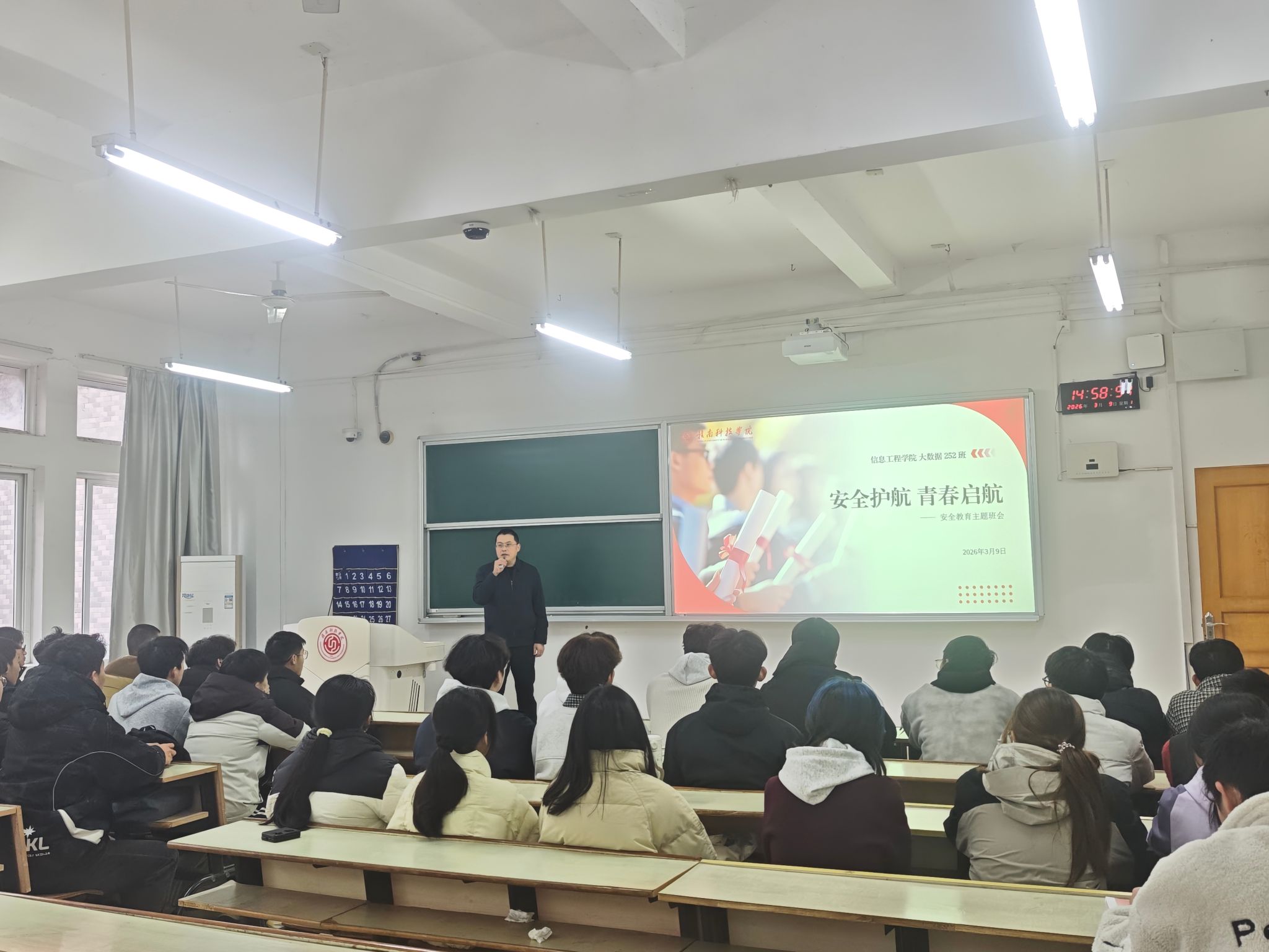 学院副院长胡健参与所联系的大数据251班新学期第一次主题班会做总结讲话。胡健强调,交通安全方面,骑行时务必佩戴安全头盔,遵守交通规则,确保出行平安。网络安全方面,提醒大家警惕网络诈骗,保护个人信息,并规范网络言行,抵制不良言论,避免引发网络舆情。生活安全方面,请同学们严格遵守宿舍管理规定,杜绝使用违规电器,注意饮食卫生,养成健康习惯。心理健康方面,希望同学们积极面对人际交往,学会沟通与包容,遇到心理困惑及时寻求帮助。