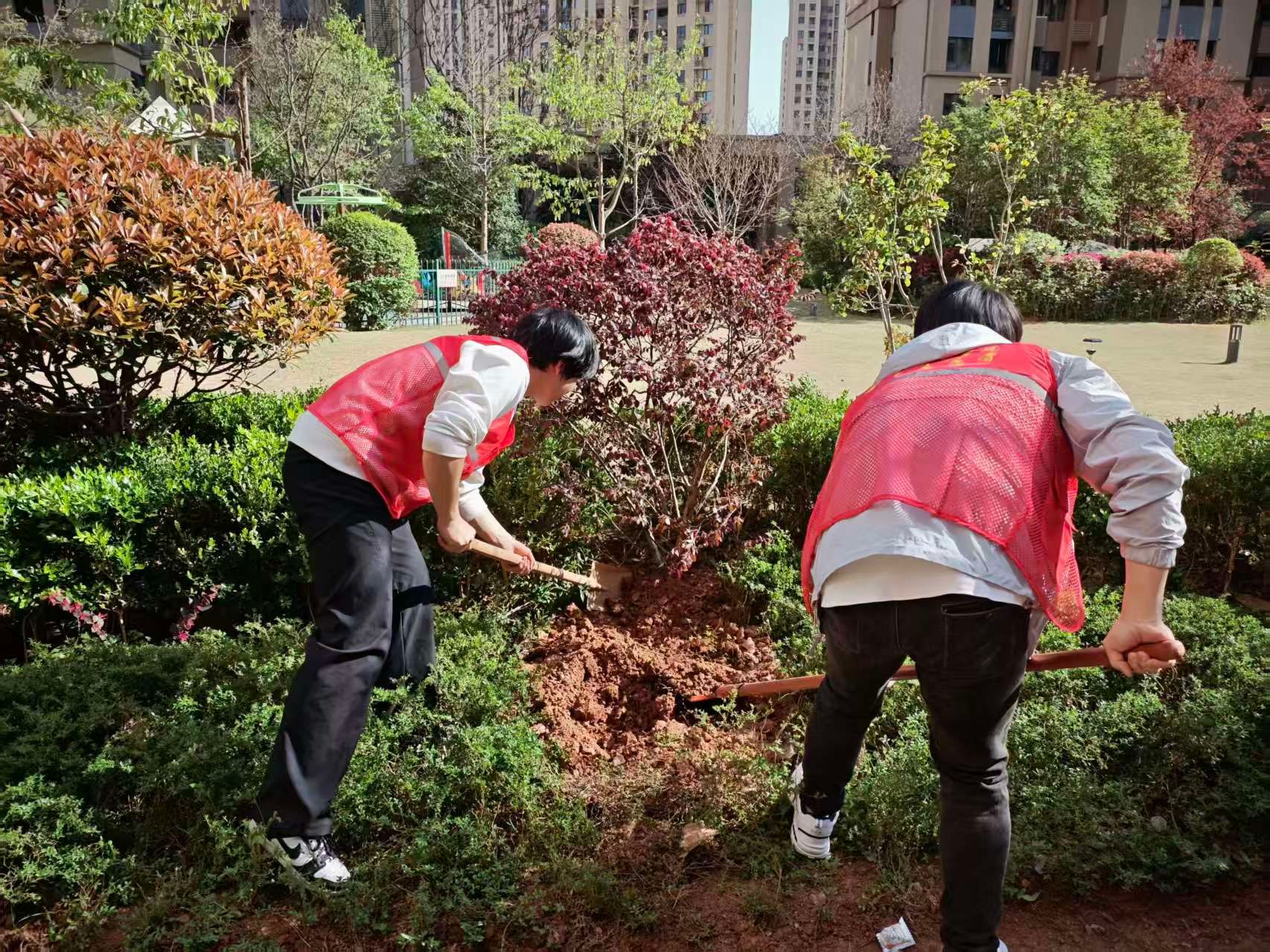 随后,志愿者们跟随社区工作人员正式开展志愿服务活动。大家手持工具,来到社区绿化区域分工协作,扶苗、培土、浇水,每一个步骤都认真细致。大家齐心协力种下一棵棵树苗,用汗水为社区增添绿意,用实际行动守护生态环境,让城市家园变得更加清新美好。
