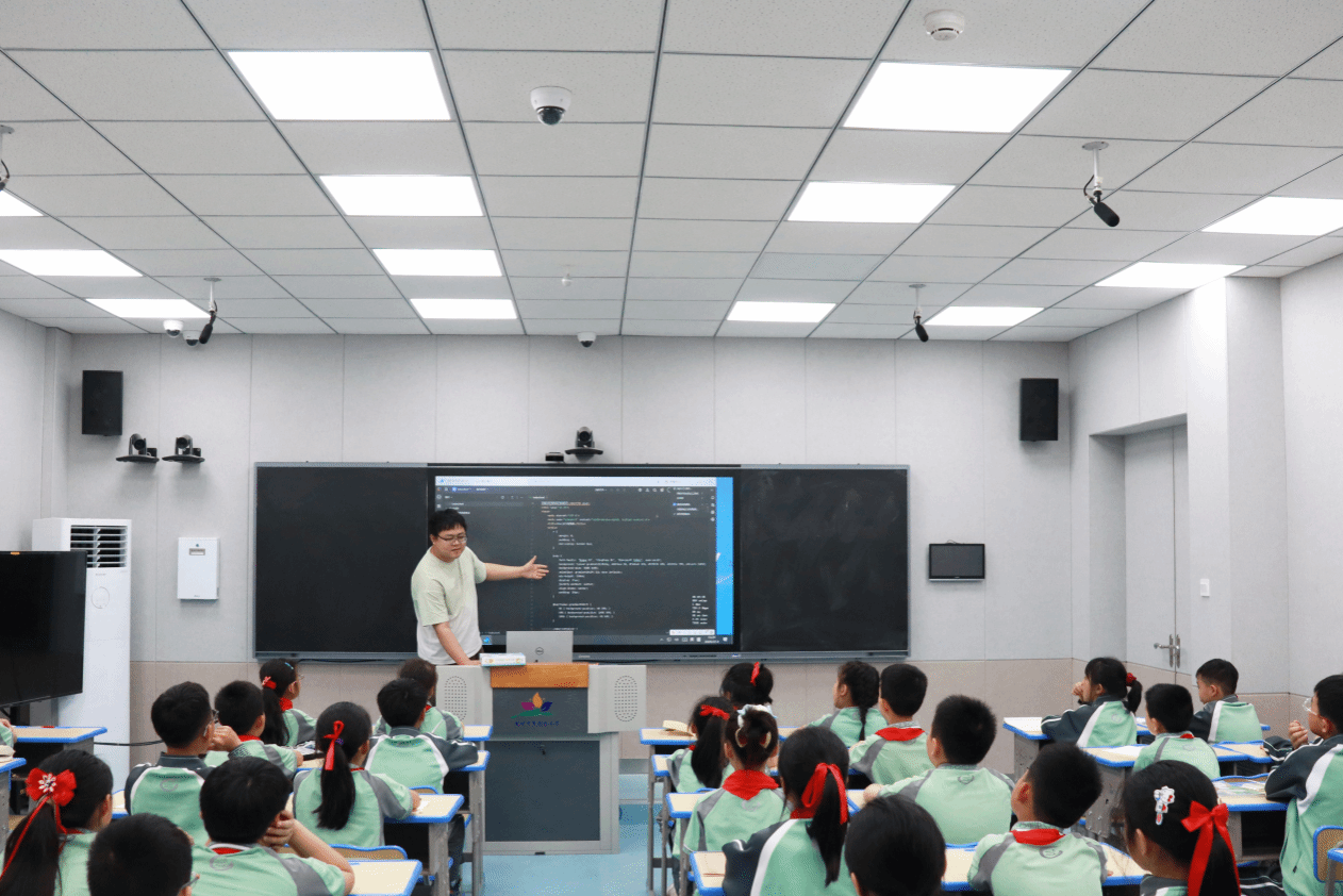 实践环节,孩子们分组上台操作实践,设置循环指令绘制创意图形。“我画出了五角星!”的欢呼声此起彼伏,成就感写在每一张笑脸上。