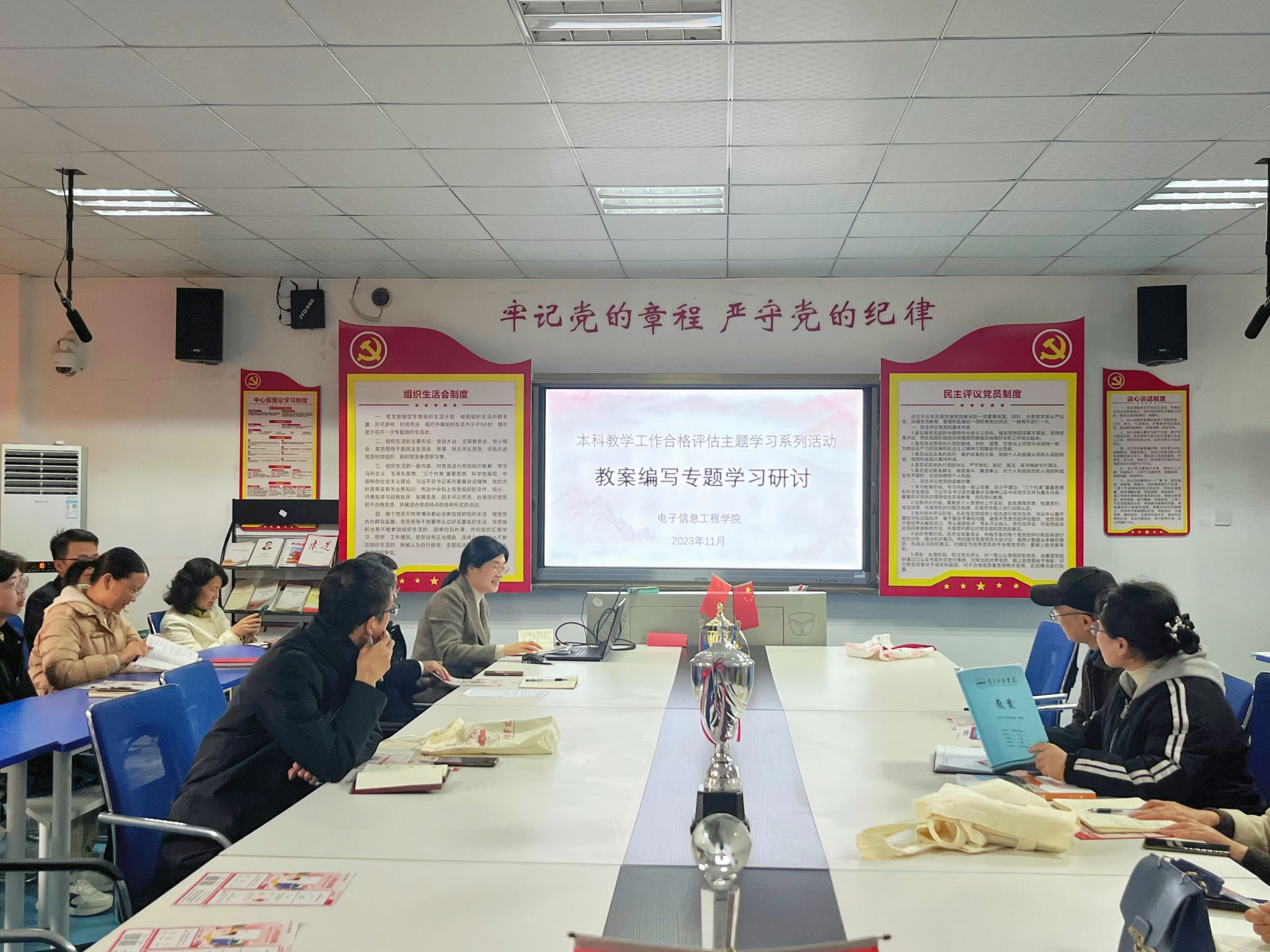本网讯:为提高我校教师教学业务水平,促进教案规范化、科学化,11月14日下午,信息工程系在明德楼1201室开展本科教学工作合格评估系列主题学习会第二期,会议由教学副主任康岚兰主讲,信息系各教研室主任及全体任课教师参加学习会。