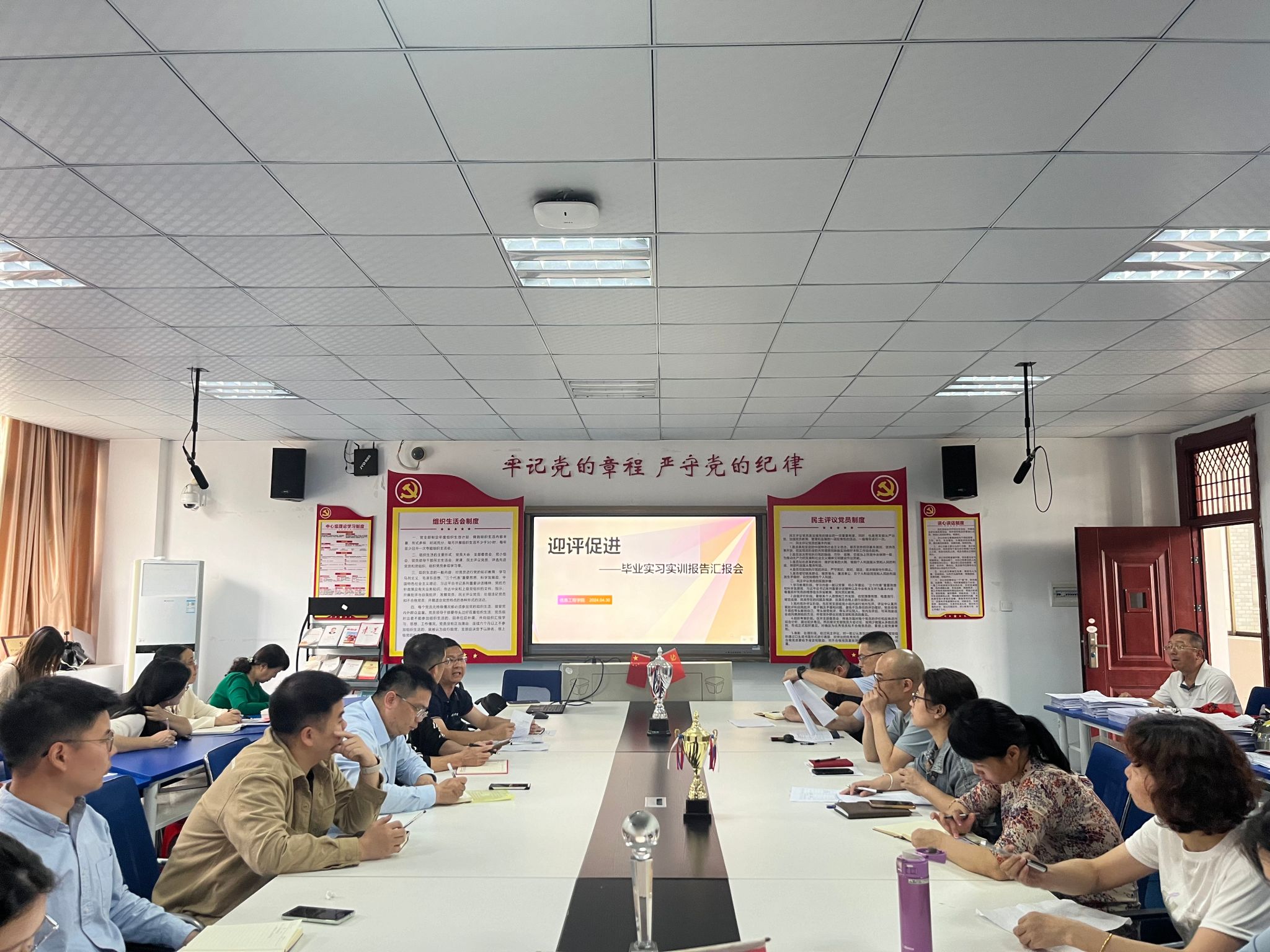 本网讯:为迎接今年的本科教学工作审核评估工作,进一步贯彻落实自评自建与自我改进的方针政策,全面了解评估,完成好评建工作,确保评估顺利通过,4月30日下午,永利y23455在明德楼1201会议室召开“迎评促建—毕业生实习实训报告汇报会”。永利y23455教学专任教师李观发主持会议并作相关汇报,学院全体教师参加。