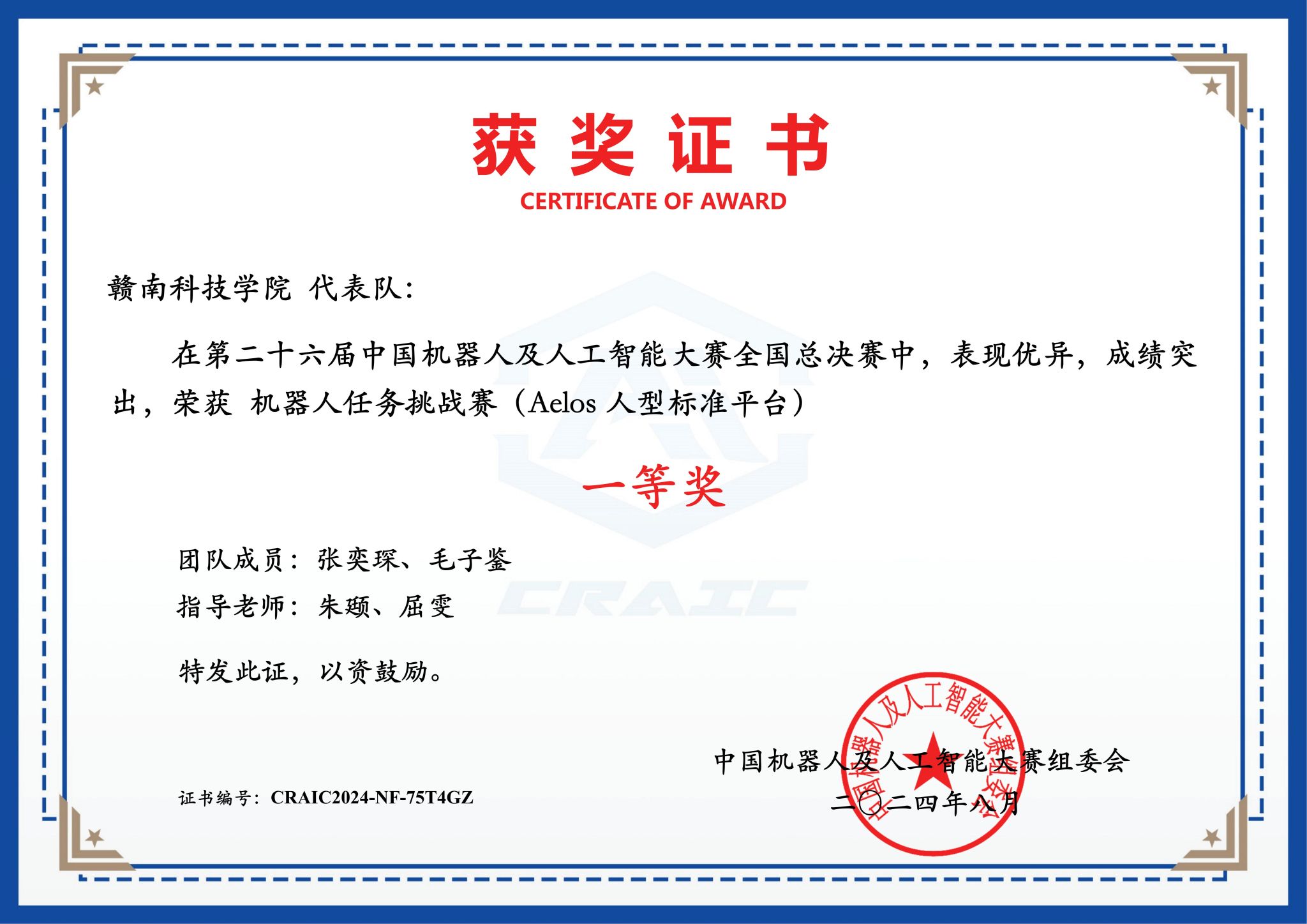 据悉,中国机器人及人工智能大赛是教育部列为本科教学评估的国家A类竞赛,此次大赛聚焦人形机器人、自动驾驶、无人机等热点技术,开展了11个项目的比赛。学校两支队伍认真准备机器人任务挑战赛(Aelos人型标准平台)项目,历经六月份省赛,七月份国赛线上赛,最终在八月份的线下赛中脱颖而出,凭借扎实的专业基础和默契的团队协作,勇夺“国家一等奖”2项。
