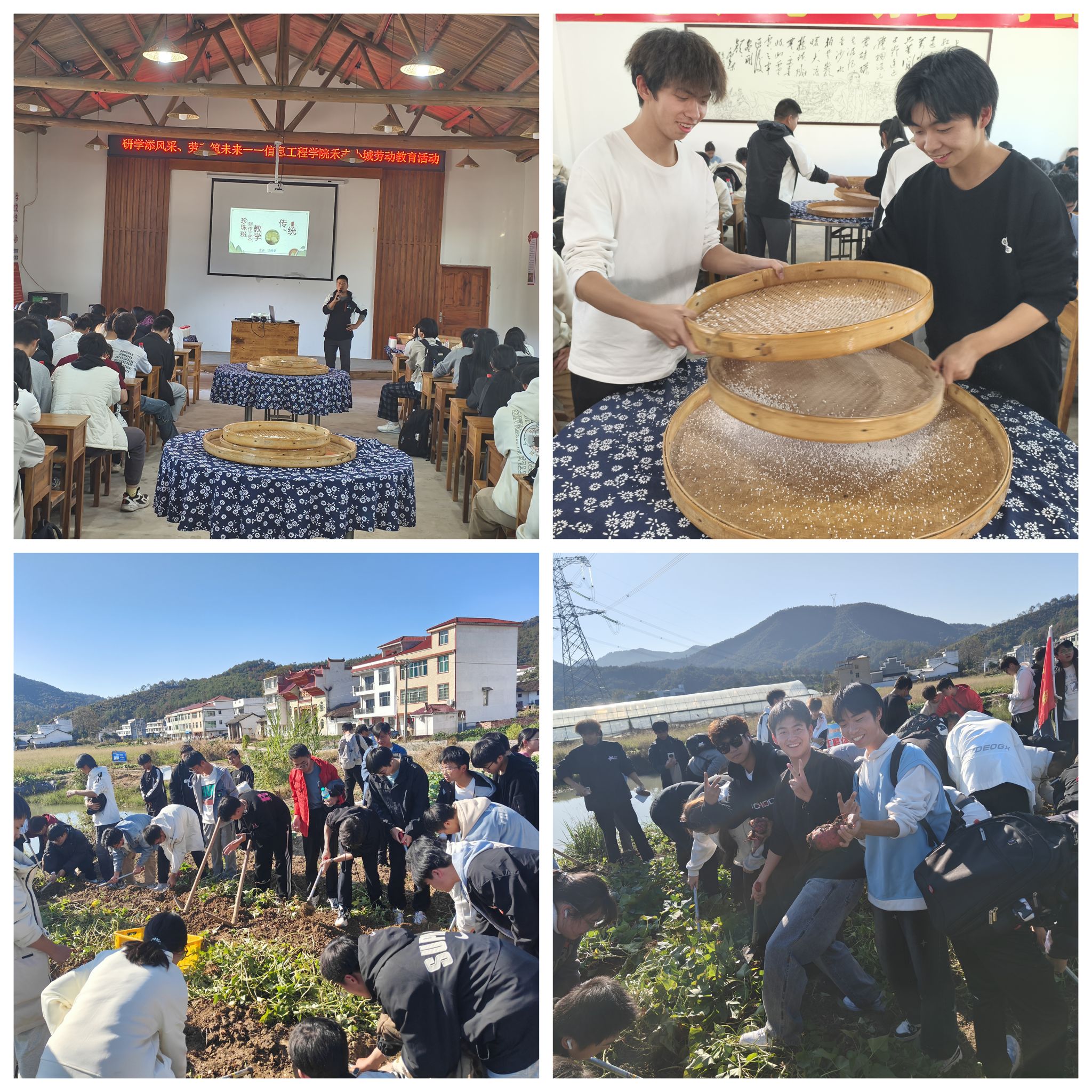 在禾丰小城的研学活动中,师生们不仅品尝了禾丰特色美食,还深度体验了当地的非遗文化。在当地居民的耐心指导下,师生们亲手参与了珍珠粉、兰花糕的制作过程。此外,户外挖红薯活动也深受师生喜爱。在广袤的田野里,同学们切身感受劳动的艰辛与收获的喜悦,体会到“一粥一饭当思来之不易”的深刻内涵。