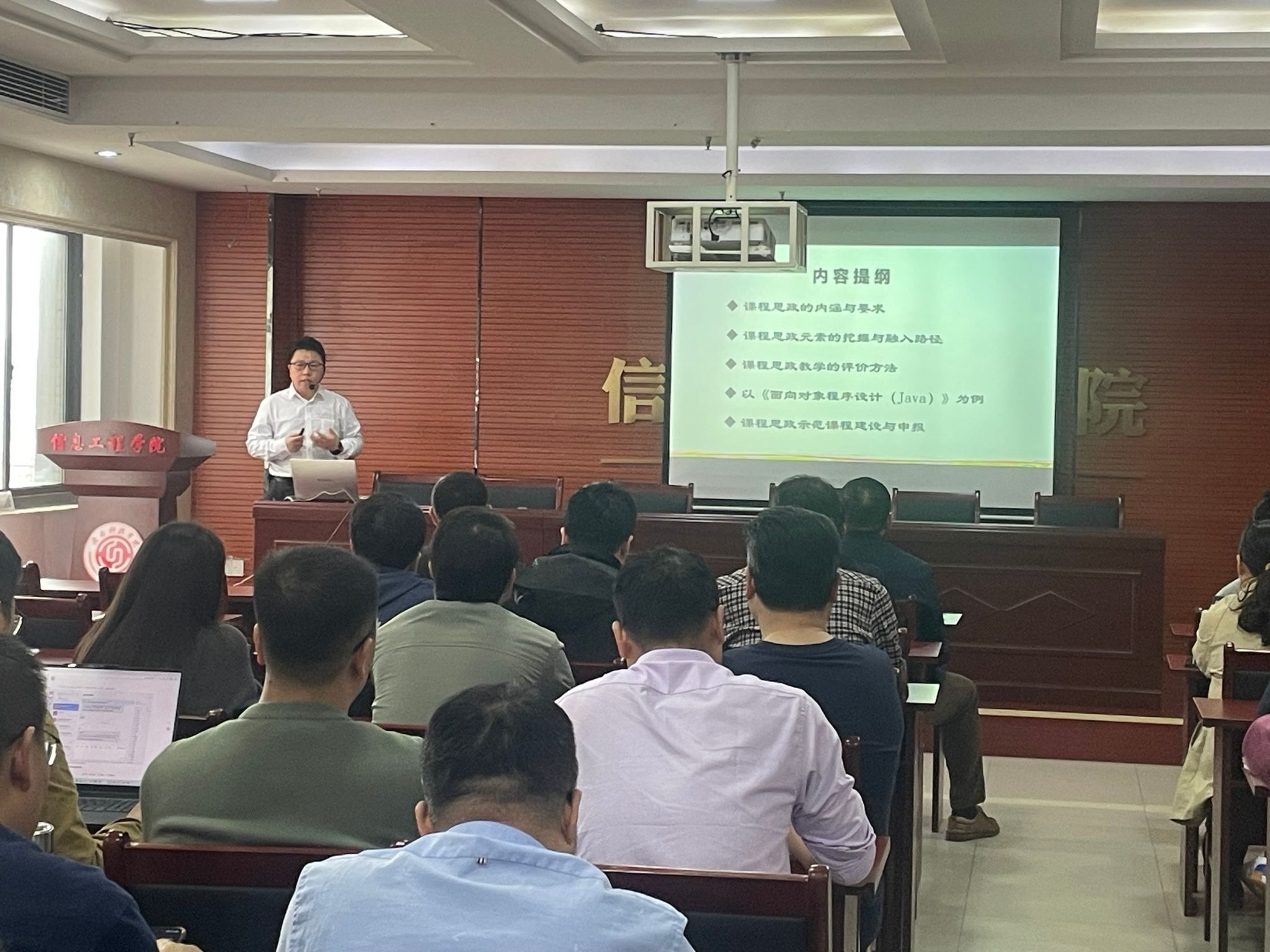 报告会上,张军教授紧扣“思政元素提炼、融入路径创新、虚实融合生态构建”三大主题,以《面向对象程序设计(Java)》为范例,系统阐述了课程思政建设的实践策略。他从国家战略需求、行业发展趋势、学科发展脉络等多维视角出发,创新构建“内容-来源-价值”三维分析体系,通过“背篓医生”远程医疗APP等鲜活案例,生动诠释了技术与人文的深度融合。张教授还首创“认知导入-知识建构-体验内化-反思升华”四阶段递进式融入路径,旨在打造沉浸式学习环境,推动思政教育从“单向灌输”向“价值共鸣”转变。同时,他构建了“认知-情感-行为”三层次评价体系与“四维成长档案”,为课程思政成效的量化评估提供了科学依据与可复制、可推广的实践模板。
