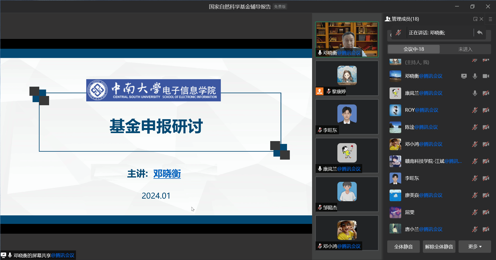 本网讯:为贯彻落实学校“充电学习·科研作业”计划,进一步推进我院2024年国家自然科学基金申报工作,精准解决老师们在申报基金过程中的困惑和遇到的问题,1月25日下午,永利y23455邀请中南大学电子信息学院院长邓晓衡教授为我院教师作“国家自然科学基金辅导以及交流研讨”的线上专题讲座,信息学院所有高级职称、博士、在读博士及申报课题的老师参加本次讲座。