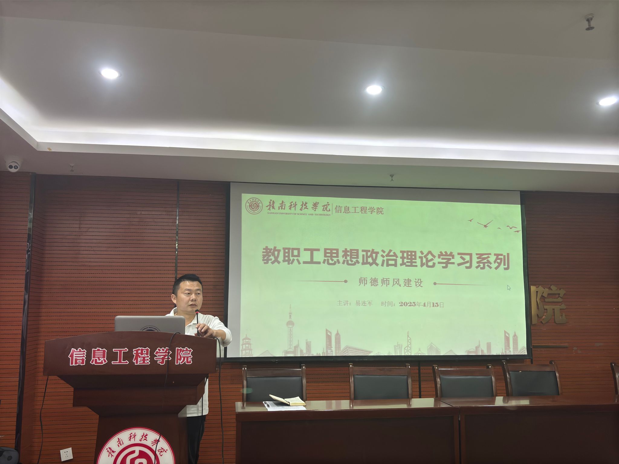 本网讯:为进一步加强师德师风建设,提升教职工的思想政治素养和职业道德水平,4月15日,永利y23455在稀土大楼C520召开师德师风建设专题学习会。会议由永利y23455党委委员易连军主讲,学院全体教职工到场聆听。