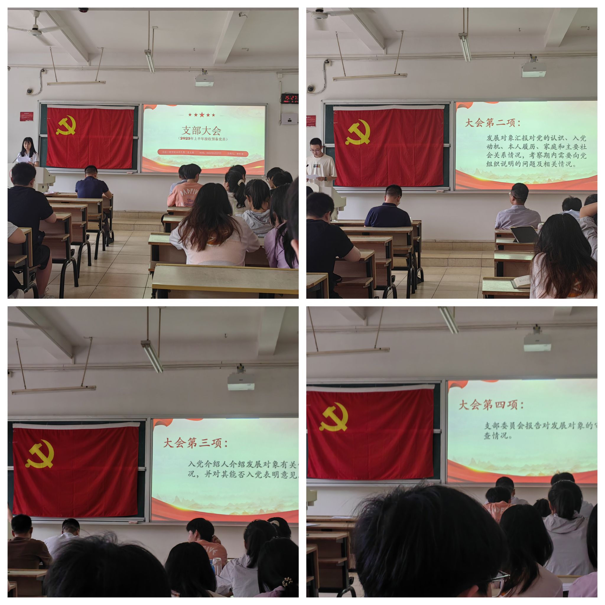 根据发展党员流程,首先,会议汇报了到场党员人数,随后,8名发展对象依次上台,他们结合个人经历与思想成长,从对党的认识、入党动机、个人履历、家庭及社会关系等方面进行详细汇报,真挚表达了向党组织靠拢的坚定决心和为党和人民事业贡献力量的强烈愿望。