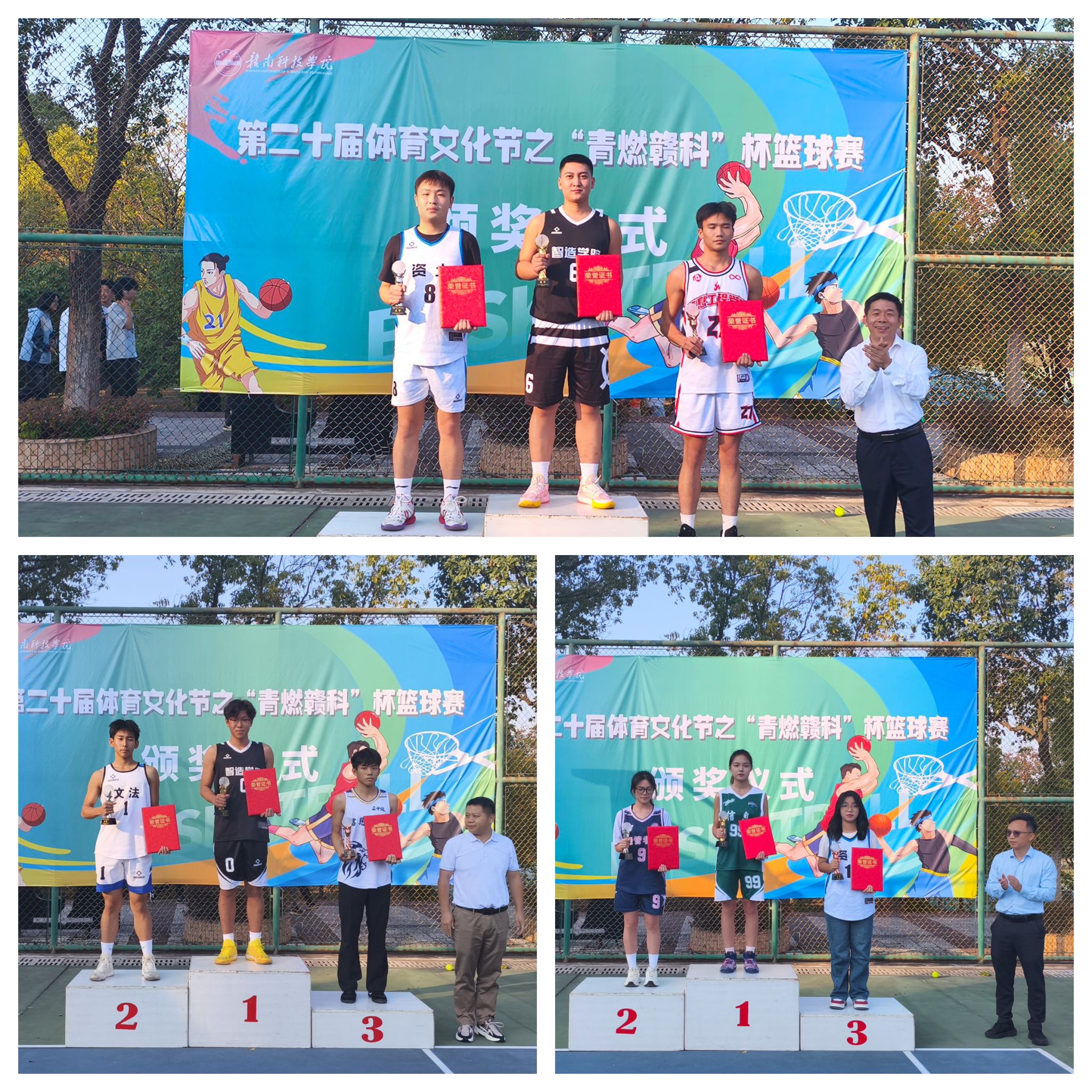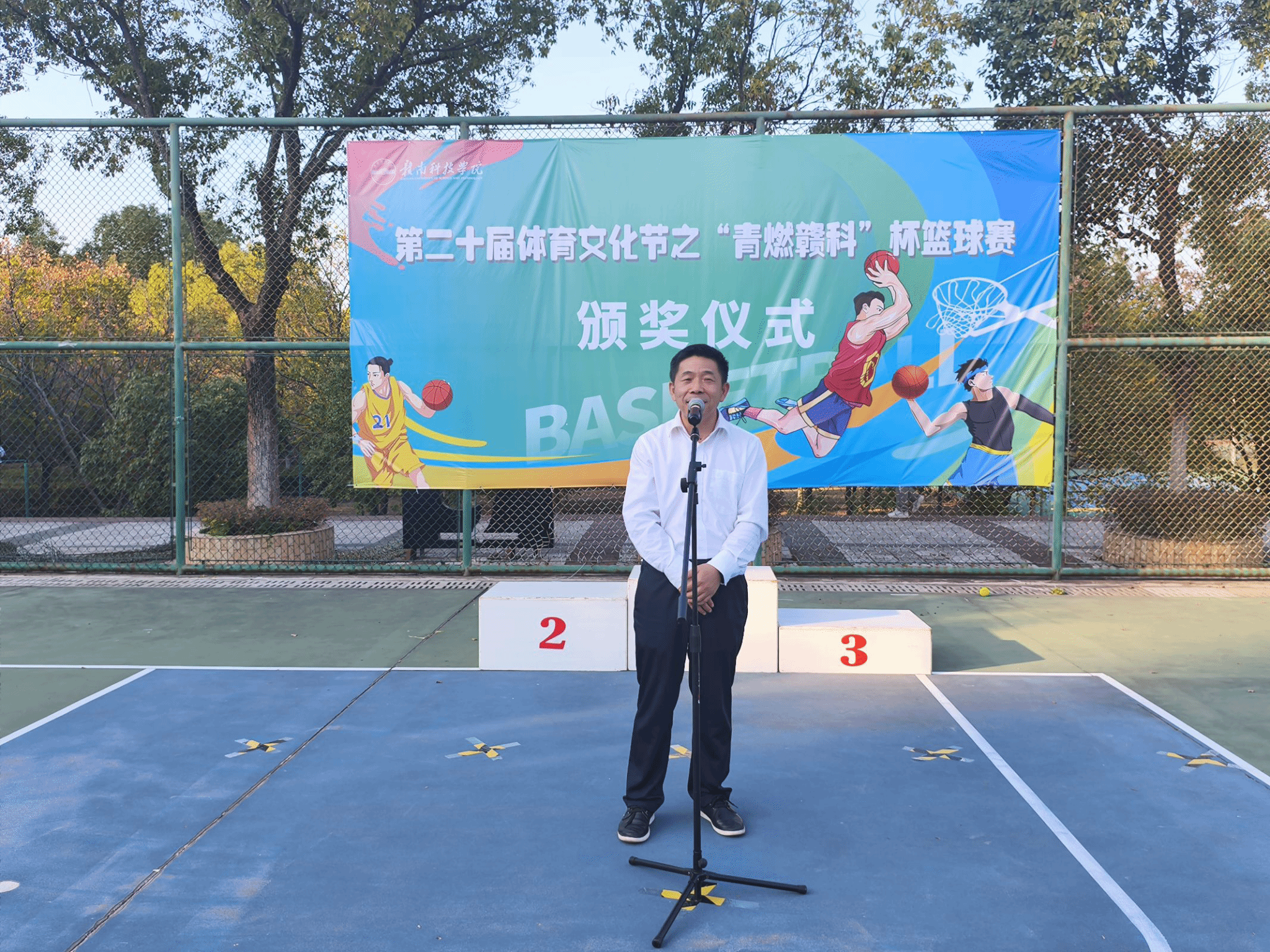 11月12日下午,篮球赛颁奖仪式在学校灯光篮球场举行。学校党委委员、副校长何锦龙上台致辞,对本次篮球赛获奖的同学表示祝贺,为参赛运动员们勇往直前、团结拼搏的奋斗精神点赞,他深切地鼓励同学们加强体育锻炼,做全面发展的新时代赣科人。