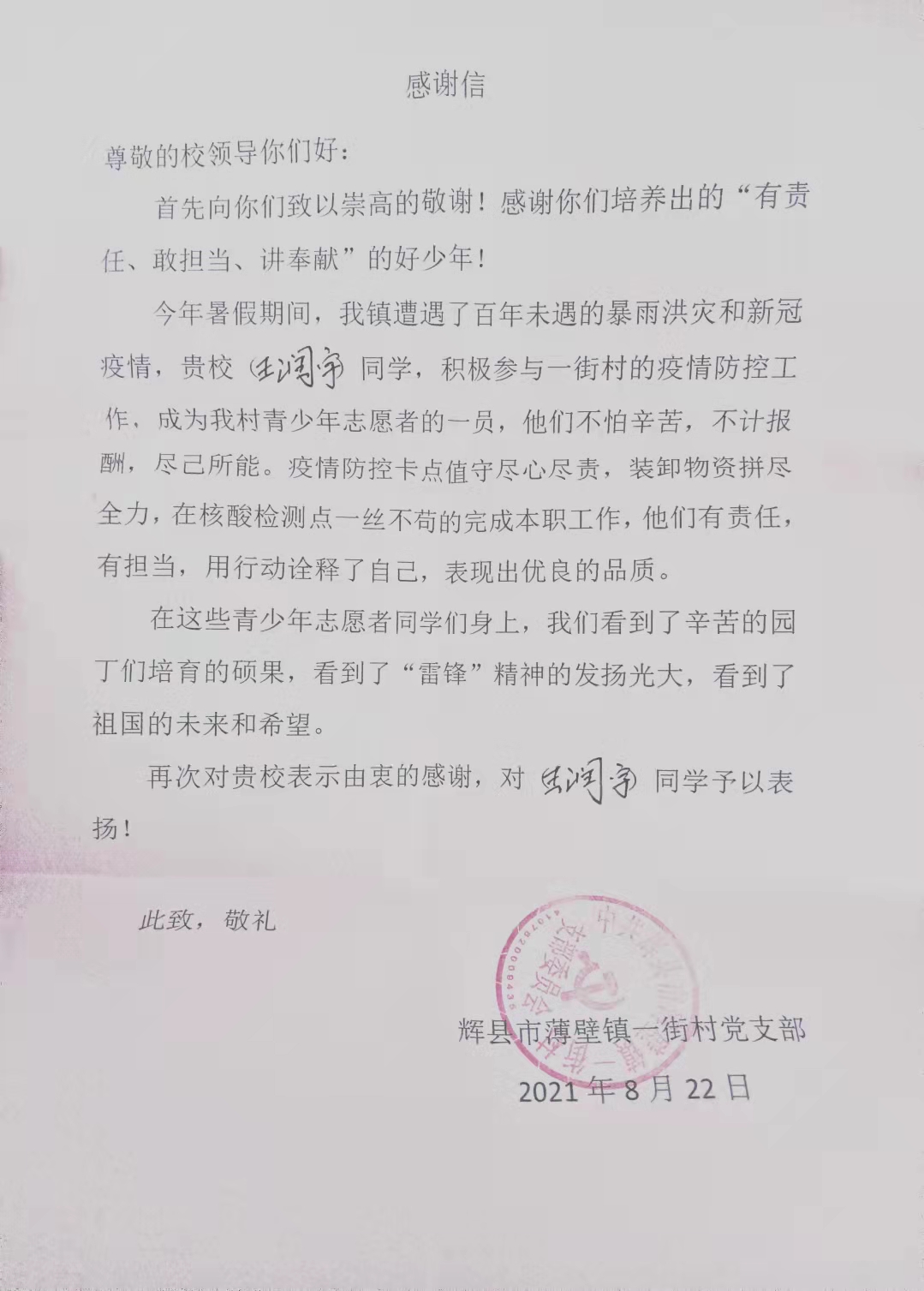 当亲眼目睹持续几天的暴雨使得许多老房子出现崩塌,亲戚家的土墙被冲毁,王润宇义无反顾加入志愿者,为家乡贡献出自己的一份力量。在志愿活动中,他积极参与疫情防控工作,不怕辛苦,不计报酬,尽己所能。值守疫情防控卡点尽心尽责,装卸物资拼尽全力,一丝不苟的完成本职工作。用自身的行动,展现了新时代青年的责任与担当。