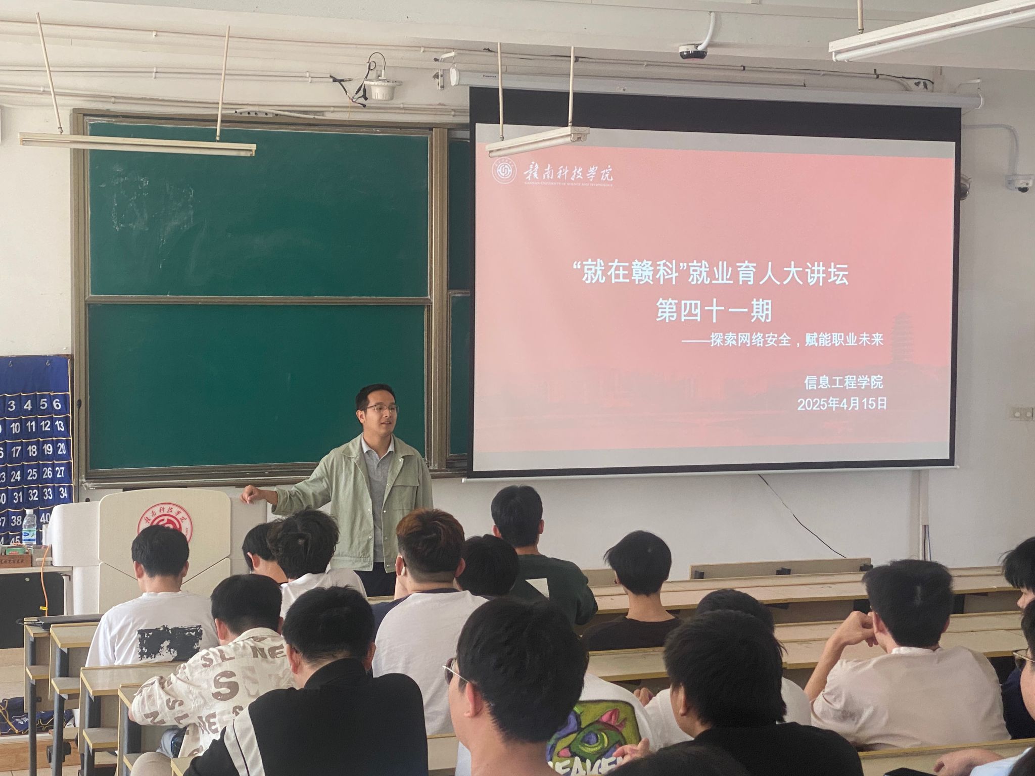 本网讯:为深入贯彻总体国家安全观,扎实推进“国家安全教育周”主题教育活动,4月15日下午,永利y23455在教学主楼Z3D2举办“就在赣科”就业育人大讲坛第四十一期,主题为“探索网络安全,赋能职业未来”。本次讲坛邀请长沙市众元网络技术有限公司副总经理颜毅及网络攻防专家苏小华老师作为主讲嘉宾,学院100余名师生到场聆听。