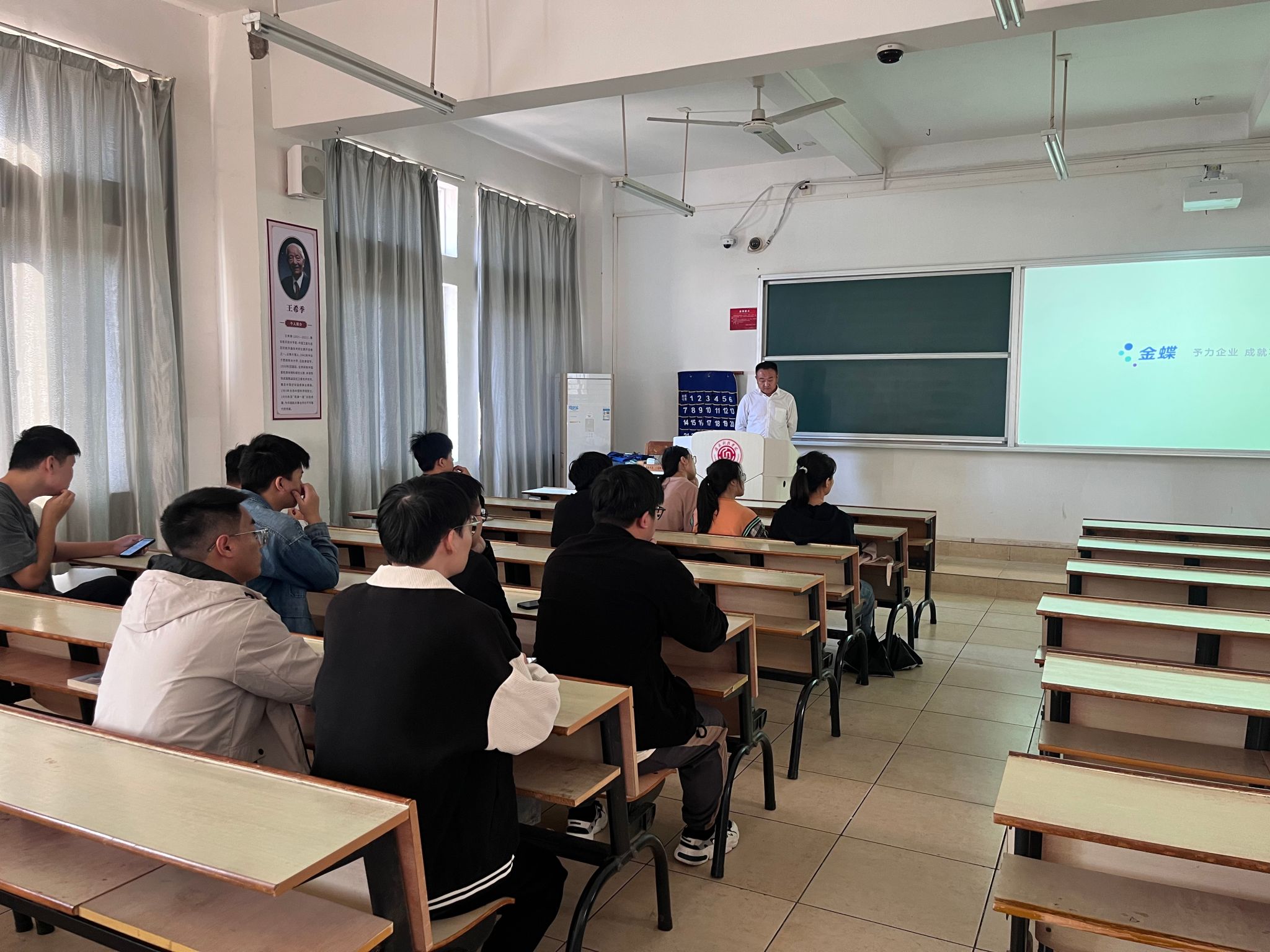 讲座中,赵明国结合企业实际和人才培养经验,围绕金蝶数智化管理软件的应用特点、ERP岗位结构、技能需求和职业发展方向进行了讲解,帮助学生深入了解数智化管理领域的发展趋势。他还结合自身从事企业管理与项目实施的经历,分享了相关岗位的工作内容与能力要求,并殷切鼓励同学们:“不仅要夯实专业基础,更要注重综合能力的培养,为未来步入职场积蓄能量。”