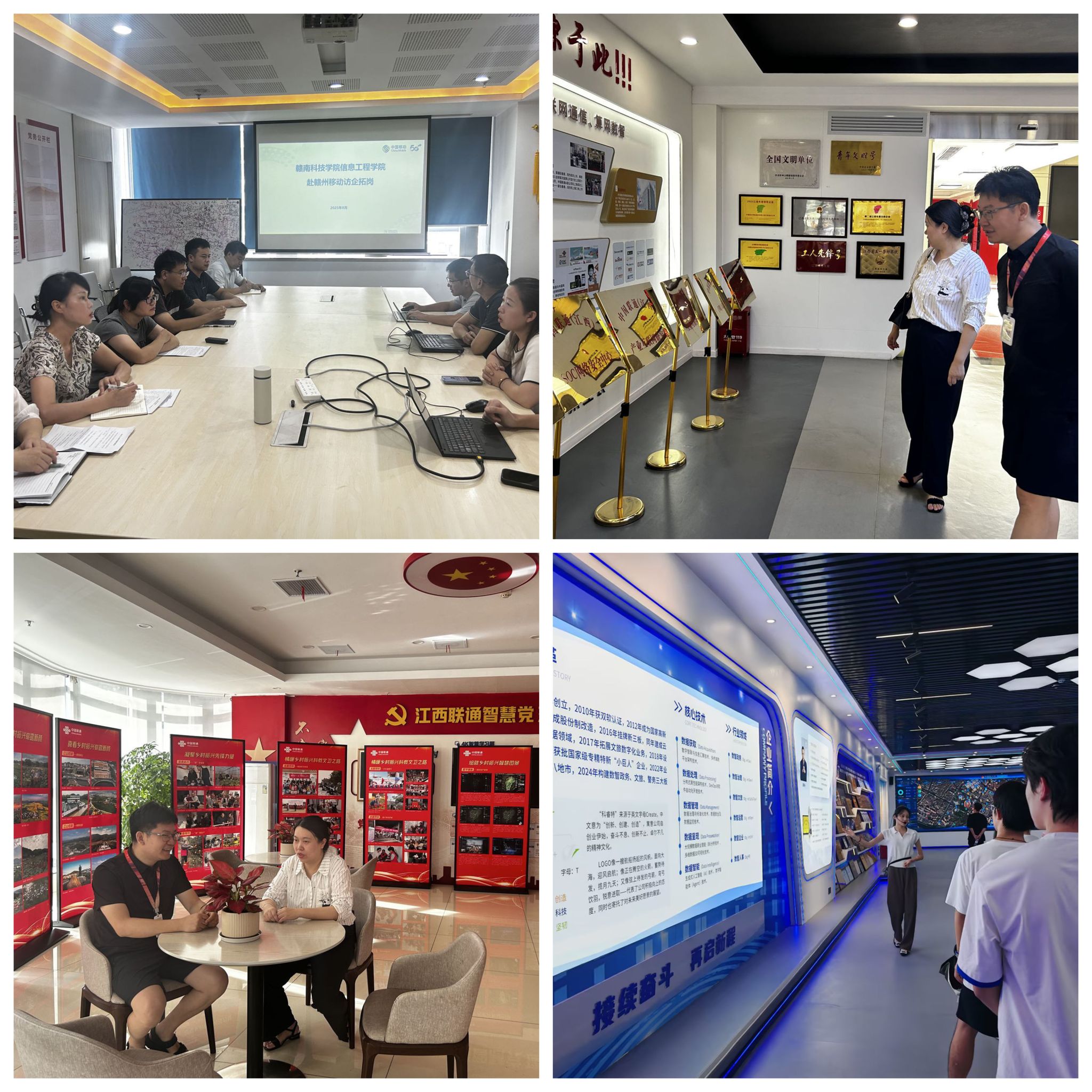 在为期数周的活动中,学院多个小组分赴各地,深入企业一线进行考察交流。走访的企业涵盖了大数据、通信技术、人工智能、软件研发、电子信息等多个前沿领域,具体包括江西国录大数据信息技术有限公司、武汉超星数图教育科技有限公司、科睿特软件集团股份有限公司、南京菲尼克斯公司、赣州尚科科技有限公司、中国移动赣州分公司、赣州尚行科技有限公司、中国联合网络通信有限公司江西省分公司、中国移动通信集团江西有限公司赣州分公司、龙南鼎泰电子科技有限公司、通用人工智能(赣州)研究院、上海寰创通信科技股份有限公司、江西诚韬科技有限公司、南昌南云信息技术有限公司、睿警信科技有限公司15家单位。
