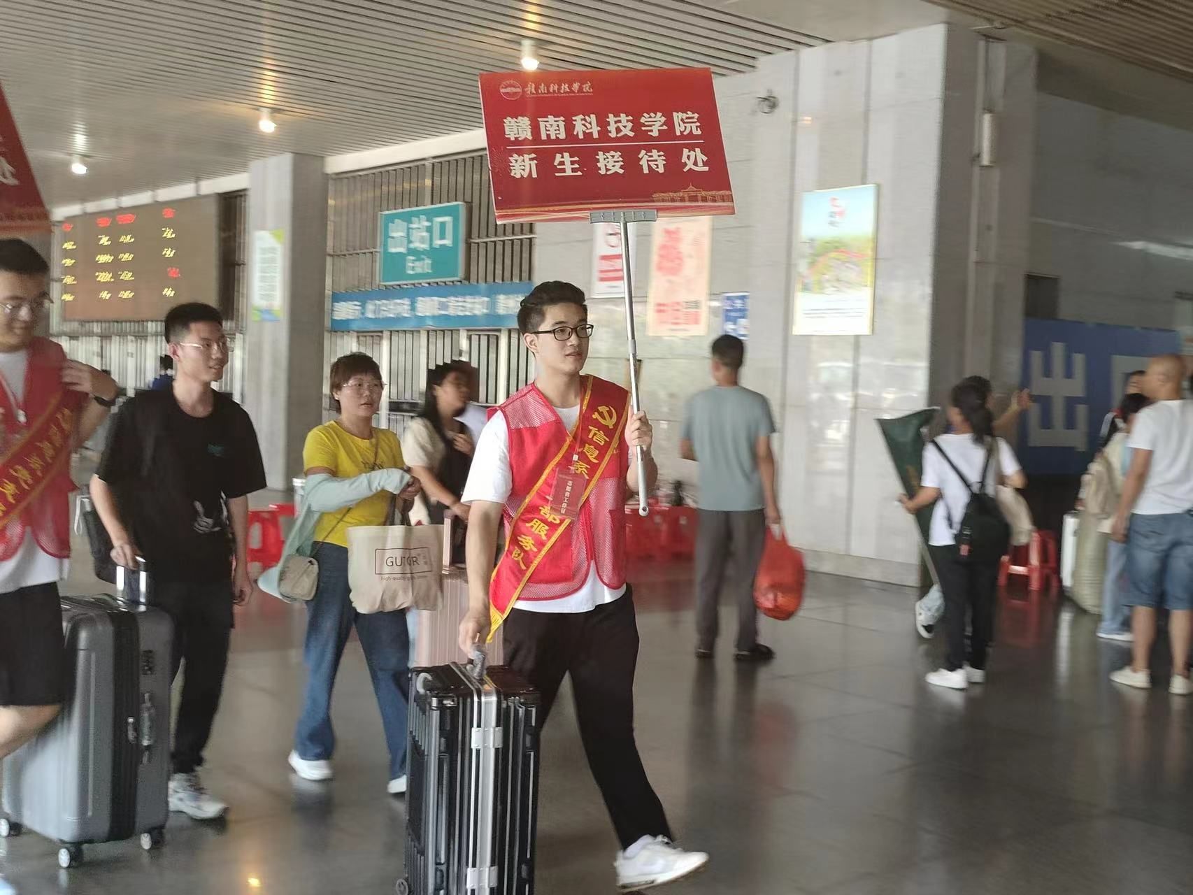 在车站迎新活动现场,举牌接站的支部同志在出站口迎接新生,并在新生出站时及时上前接待和搬运行李,引导新生到接待处进行个人信息登记后,分批次安排车辆接送新生到校报到。同时支部同志以亲切热情的态度为新生及家长细心解答疑惑,让新生及家长能够在到校前能更加了解学校。