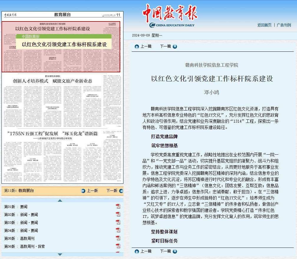 本网讯:9月9日,《中国教育报》第11版“教育展台”栏目刊发了我校永利y23455党委副书记邓小鸿题为《以红色文化引领党建工作标杆院系建设》的文章,对永利y23455党建工作标杆院系建设做法进行总结介绍。文章链接:http://paper.jyb.cn/zgjyb/html/2024-09/09/content_144750_17792676.htm。