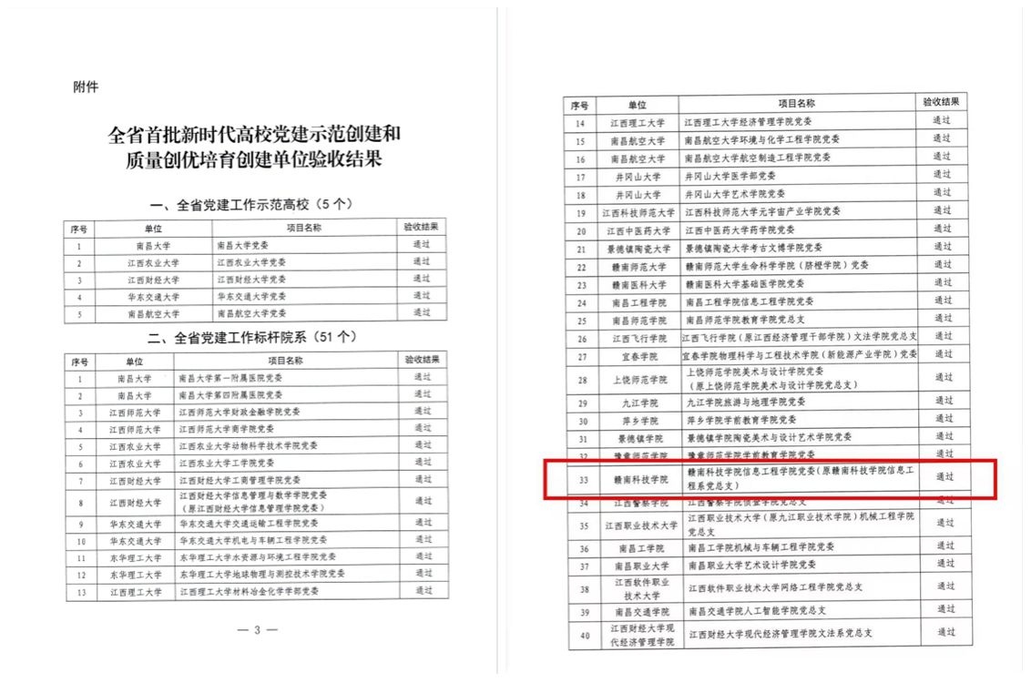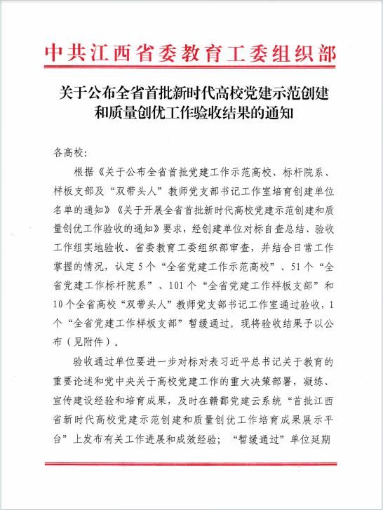 本网讯:近日,省委教育工委组织部发文公布全省首批新时代高校党建示范和质量创优工作验收结果,经创建单位对标自查总结、12月验收工作组实地验收及省委教育工委组织部审查,永利y23455党委圆满完成建设任务,顺利通过“全省党建工作标杆院系”验收。