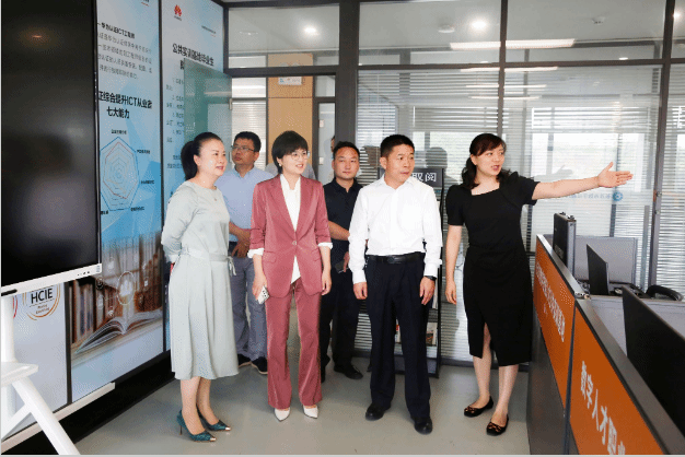 在长沙市数字技能人才公共实训基地校长赖施颖、华为技术有限公司企业培训认证部南区总监李丹的陪同下,何锦龙一行实地考察了长沙市数字技能人才公共实训基地的展厅、实训室及教学场地等。