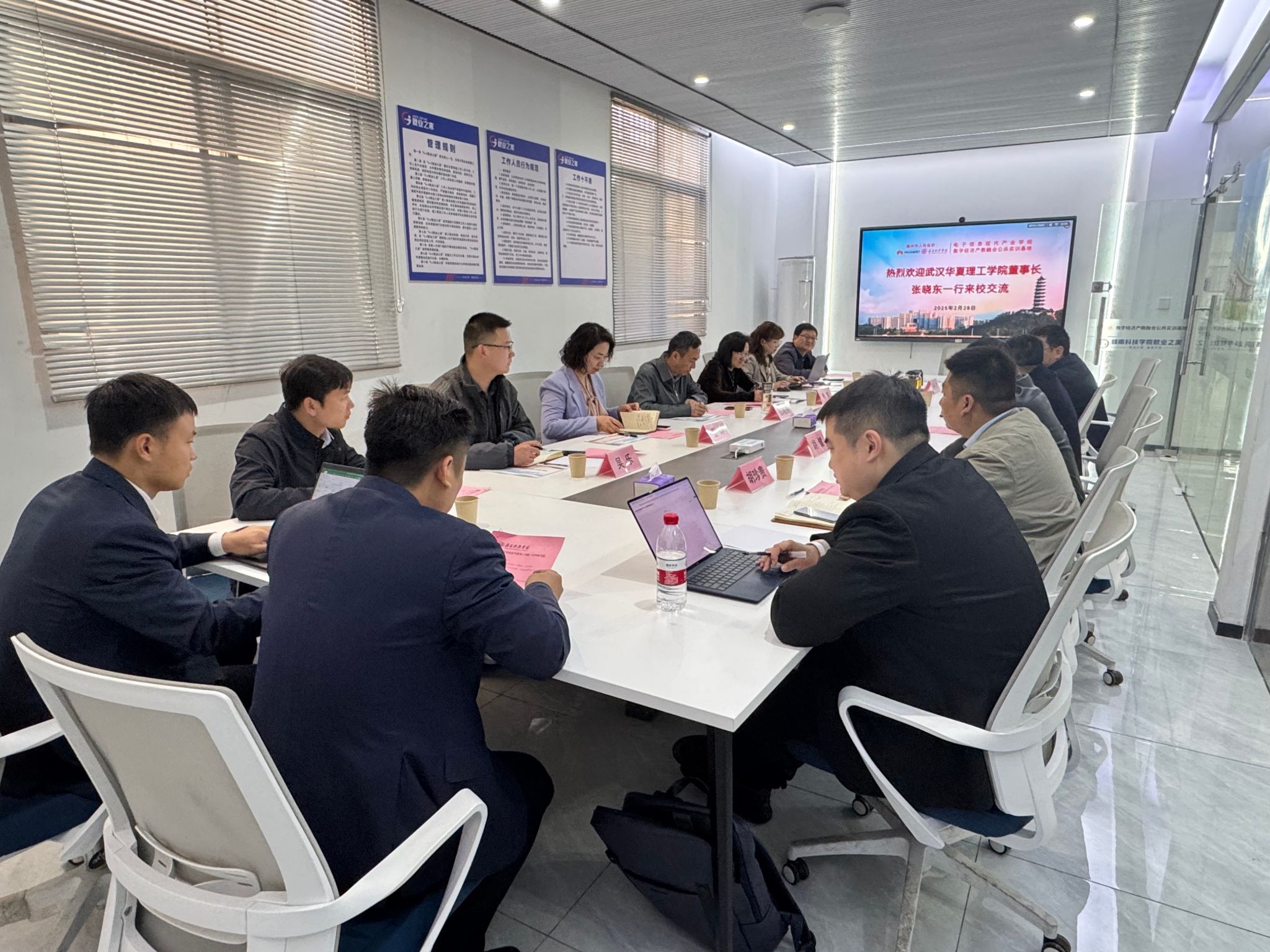 本网讯:2月28日上午,武汉华夏理工学院董事长张晓东一行来访,就产教融合、应用型人才培养及产业学院建设等议题与我校展开深入交流。学校党委委员、副校长何锦龙,永利y23455领导班子、电子信息现代产业学院及数字经济产教融合公共实训基地负责人热情接待来访人员。