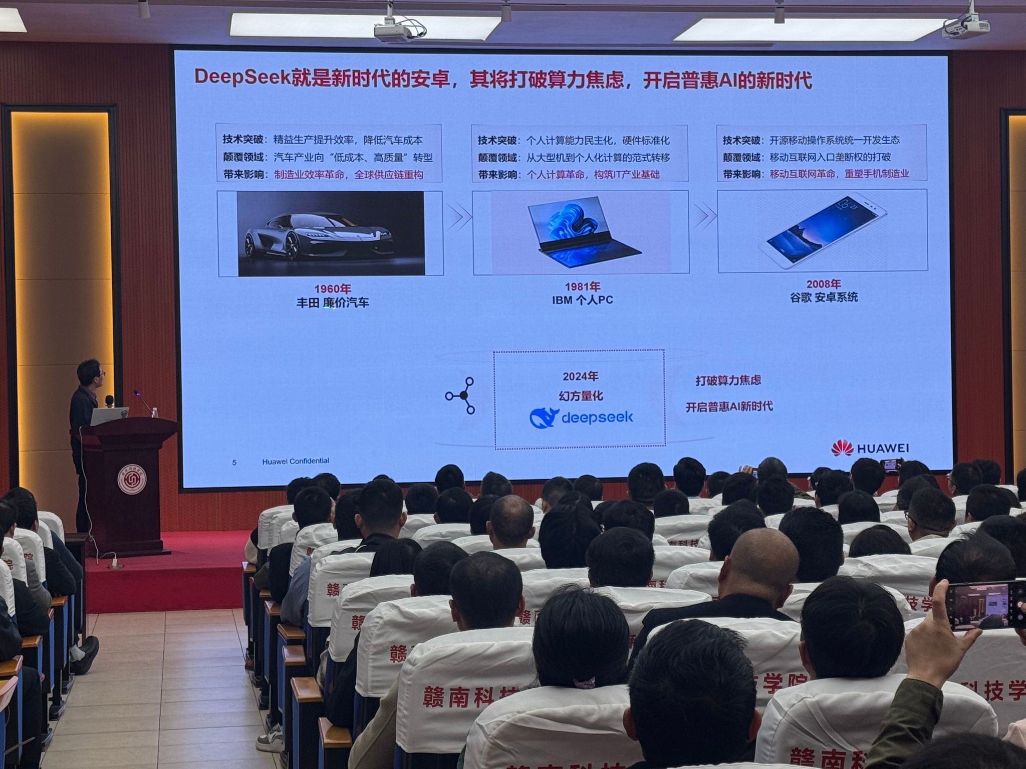 本网讯:3月1日上午,由我校数字经济产教融合公共实训基地主办,江西产教融合人才发展有限公司承办的“DeepSeek赋能行业应用与实践”大咖公开课在图书馆学术报告厅成功举办。讲座内容丰富、精彩纷呈,现场座无虚席,共有来自政府部门、企业、高校等80家单位的300余人聆听了讲座,是“大咖公开课”开办以来参与单位最多的一次。